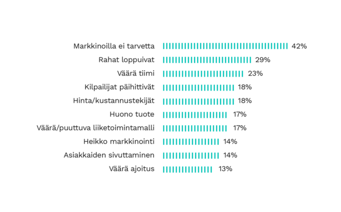 - Kilpailijat päihittävät ja huono tuote: jos et pysty tarjoamaan jotakin uutta, jota asiakkaat haluavat ja tarvitsevat, suunnitelmissa ei kannata edetä.